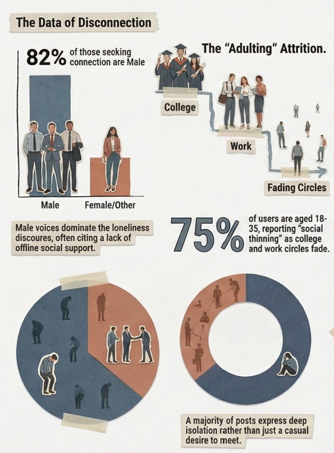 Here’s the first thing that hits you in the demographic breakdown: 82 percent of those actively seeking connection online are male. Eighty-two. The infographic doesn’t need to editorialize. The number does the work. Male voices dominate the loneliness discourse, often citing a complete lack of offline social support, and the Reddit anonymity seems to provide the only safe container for that admission. Men are, as the data suggests, statistically less likely to disclose loneliness face-to-face. So they type it out at midnight into a thread about Powai meetups and hope someone responds.