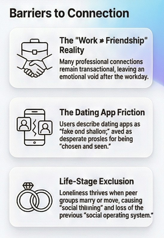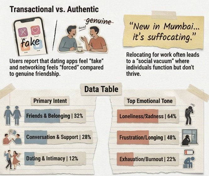 And the dominant need? Not events. Not speed dating. Not networking mixers. A full 52 percent of sampled posts were seeking Friends and Belonging. Another 28 percent wanted Conversation and Support. Only 12 percent were explicitly looking for Dating or Intimacy, and even those, when you read the verbatims, aren’t really about romance. They’re about wanting to be chosen. To be seen. To be anchored in someone else’s attention.