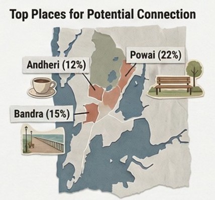 Powai, interestingly, emerges as the top neighbourhood for potential connection at 22 percent of such mentions, followed by Bandra at 15 percent and Andheri at 12 percent.
