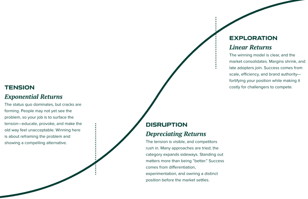 Bina’s framework for market phases is instructive here. Markets move through three predictable stages: Tension, Exploration, and Disruption. Each phase has its own rules for success. Deploy the right strategy at the wrong stage and you’re dead in the water. The strategist’s job is to read which phase you’re in and what that means for where you place your bets.