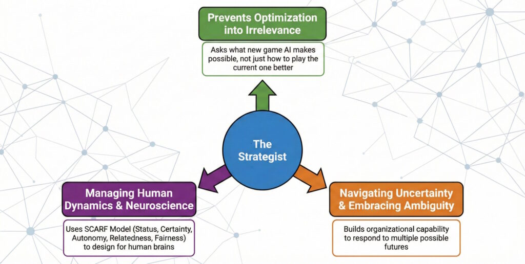 In neuroscience terms (David Rock’s SCARF model), the strategist manages the organization’s threat and reward responses. Status, certainty, autonomy, relatedness, fairness. These aren’t soft skills. They’re the fundamental organizing principles of human brains in social systems.