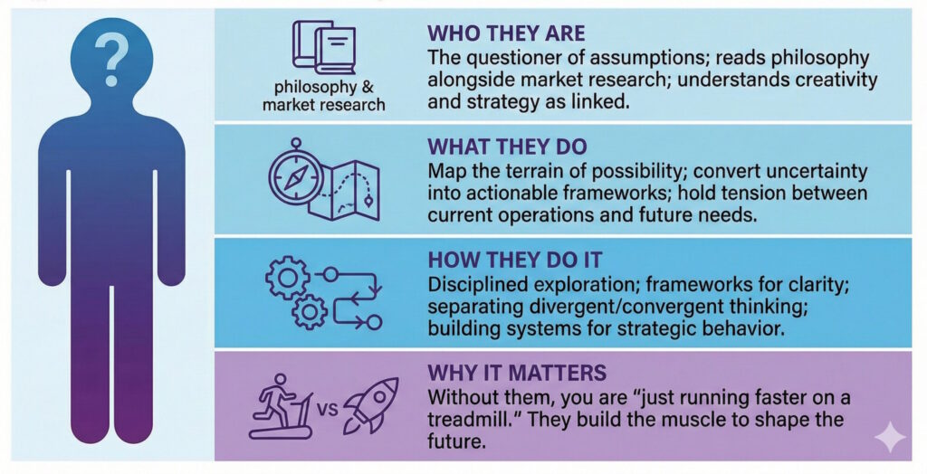 What do they do? They map the terrain of possibility and guide the organization through it. They convert uncertainty into actionable frameworks. They hold the tension between what’s working now and what needs to change for tomorrow. They create the intellectual architecture that allows everyone else to do their jobs better.