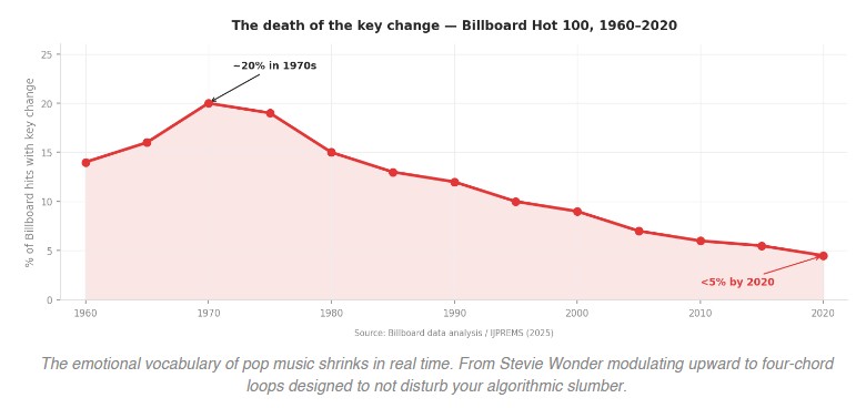 Research published in the Journal of Popular Music Studies found the tempo range of Billboard Hot 100 songs has narrowed dramatically since the 1990s. An analysis of six decades of Billboard data shows key changes (those moments when Stevie Wonder would modulate upward and you’d feel your chest lift involuntarily) declined from around 20% of hits in the 1970s to less than 5% by 2020. Dynamic range has collapsed, in what engineers grimly call the loudness war. Song structures have converged: shorter intros, hooks arriving before the 30-second mark because that’s when a stream officially “counts” for royalty purposes.