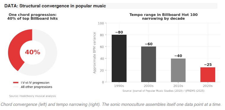 Here’s what happens to music when the algorithm runs the show long enough. Hooktheory, the music analysis company, found that one chord progression — I-V-vi-IV — now appears in nearly 40% of top Billboard hits.