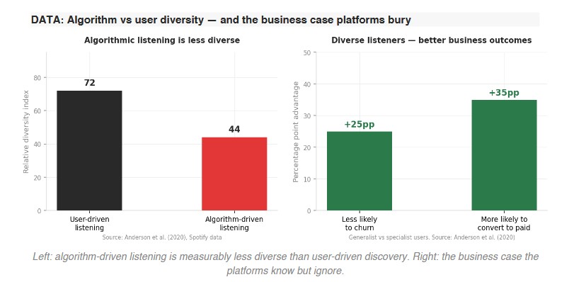 Anderson et al. found something interesting and somewhat damning for platforms: higher content diversity among users is strongly associated with better business outcomes. Generalist users, people who listen across genres and explore widely, are up to 25 percentage points less likely to leave the platform, and up to 35 percentage points more likely to convert to paid subscriptions. So the platforms actually know that diversity retains users long-term.